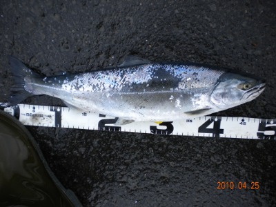 ![]() 海アメ狙いで兄貴Nと浜益へ行ってきた ![]() ![]() 現地到着は、AM3:30 ![]() 波は凪いでいた ![]() 前回釣行の時にKJ-11ピンクでゲットしているので、今回もKJを使用 ![]() そして今回も釣り歩き ![]() ![]() 僕が思ったのは、サーフの釣りは毎回ポイントが違うのではないかということだ ![]() 前回離岸流があったポイントに入ってみても、あまり抵抗が感じられないということがしばしばある ![]() なので今回も釣り歩きなのだ ![]() ![]() KJで駐車スペースから道流提まで釣り歩くが、全く反応が無いので岡ジグに変更 ![]() 道流提から、駐車スペースへ向かって釣り歩いていると、丁度中間あたりでヒット ![]() ![]() なんだ海アメと違って横に走るなぁ ![]() と思いながら巻いてくると、魚体が見えてきた ![]() ギラッと光が見え海アメで無いことが判明 ![]() デカイウグイか と思ったが挙げてみてビックリ![]() ![]() 48cmのサクラマスだった ![]() AM5:30頃の出来事だ ![]() 僕は興奮して「サクラだぁ~!!」と叫びながら兄貴の元へ走った ![]() ![]() 兄貴が言うには、道流提でサクラが挙がるというのは聞いた事があるが、サーフ側で挙がるってのは、聞いたことがないと言っていた ![]() その後、兄貴も40cmの海アメを挙げて納竿となった ![]() ↓ポチッとしやす にほんブログ村 今回使用タックル 『2010/04/18 浜益サーフ 海アメ』参照 今回使用ルアー 岡ジグAT30(ブルー) |